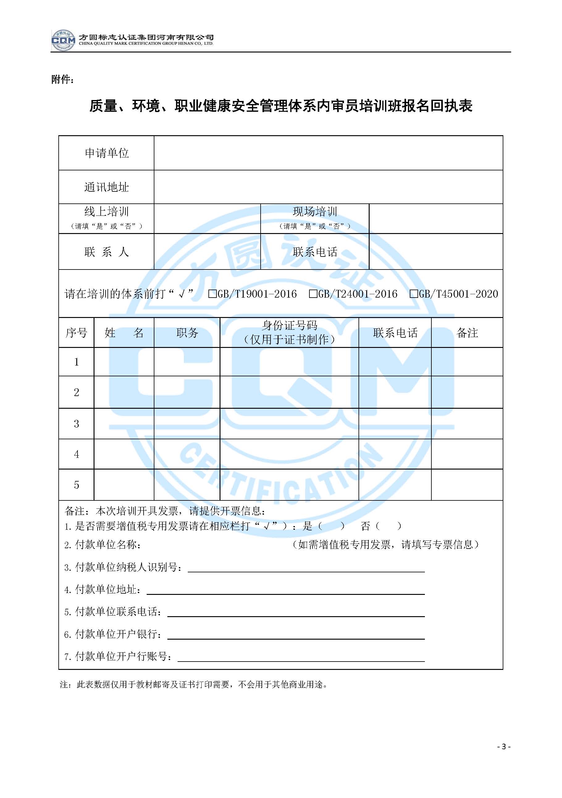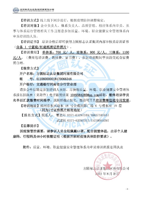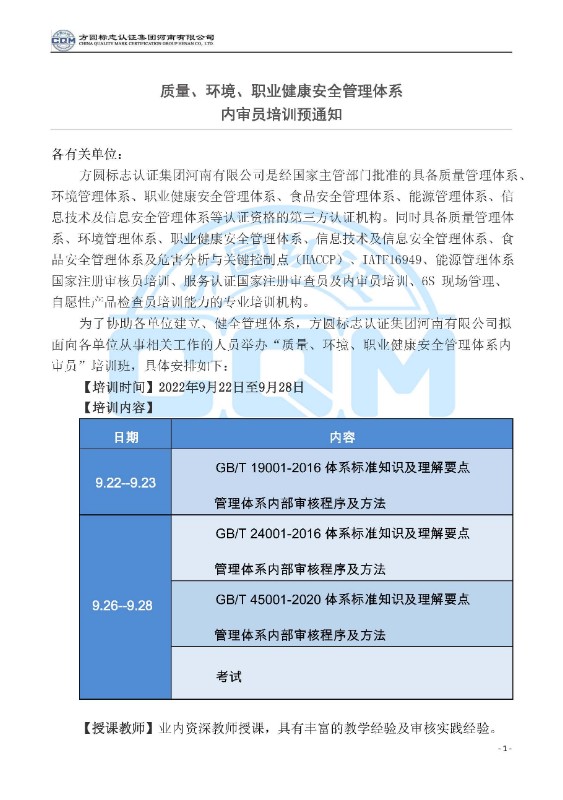 方圓標志認證集團河南有限公司關(guān)于舉辦質(zhì)量、環(huán)境、職業(yè)健康安全管理體系內審員培訓班的通知